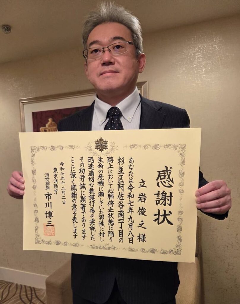 東京医科大学整形外科学分野の立岩俊之と申します。先日思いがけず救急対応する出来事に遭遇し、消防総監感謝状を拝受致しましたので、その体験を皆さまに共有させていただきたいと思います。